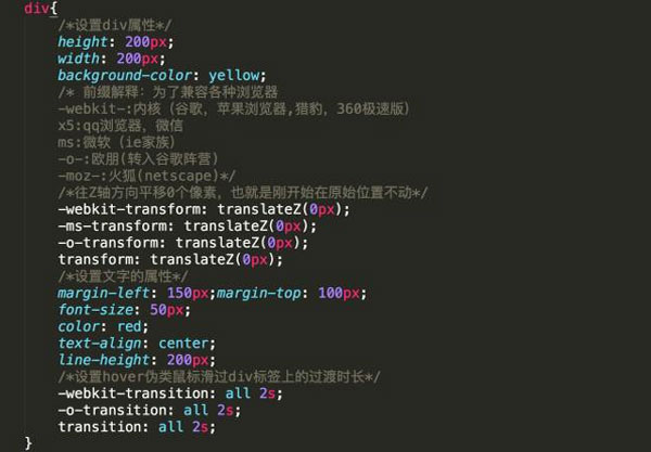 第三個(gè)方向:translateZ(z) 定義 3D 轉(zhuǎn)化,僅使用用于 Z 軸的值,以Z軸平移;對(duì)于這個(gè)角度的值,就得有三維空間的想象力了,那么,往Z周的正方向來(lái)平移,也就是相當(dāng)于與我們眼睛目視前方的距離越來(lái)越近;做個(gè)實(shí)例,我們來(lái)看一下;我們還是使用上面這個(gè)已經(jīng)創(chuàng)建好的div標(biāo)簽,稍作修改,看下效果;