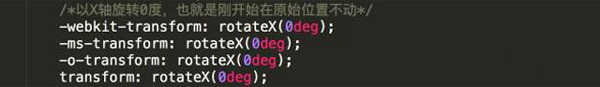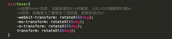 同樣,我們還是以上面這個(gè)div為例,只需要將里面的transform部分修改為rotateX,沿X軸旋轉(zhuǎn);(只看修改代碼的部分)