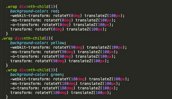 接著,設(shè)置"魔方"的幾個(gè)面自己的屬性,也就是各個(gè)面小div的屬性;先設(shè)置三個(gè)面看看效果;同時(shí)讓六個(gè)div上一個(gè)的div發(fā)生旋轉(zhuǎn)角度,便于我們觀看;