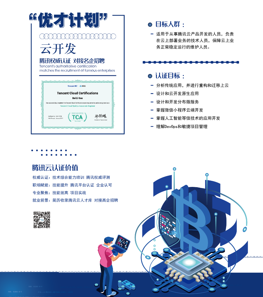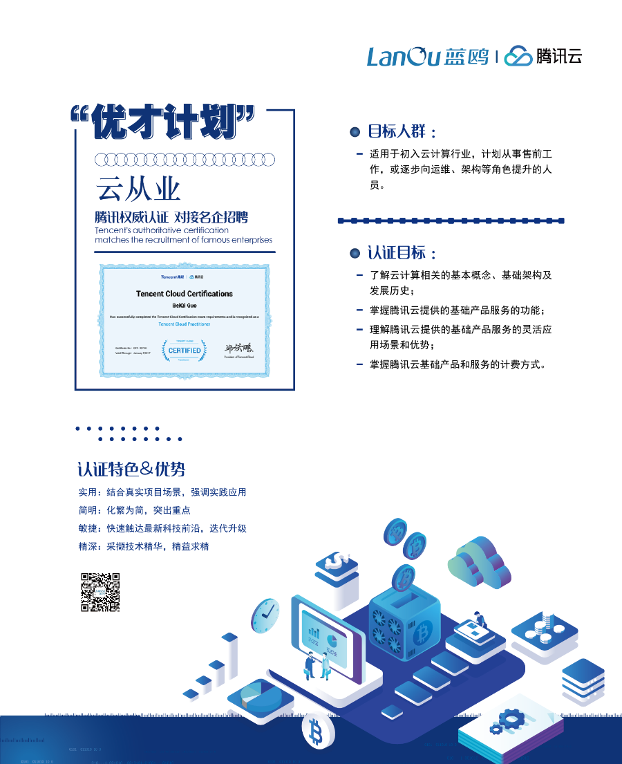 屆時培訓結(jié)束同學們可以參加相應的【優(yōu)才計劃】認證考試,得到騰訊云的官方認證,爭取在就業(yè)前為自己加分加碼,在日后職場上爭取更好的機會!